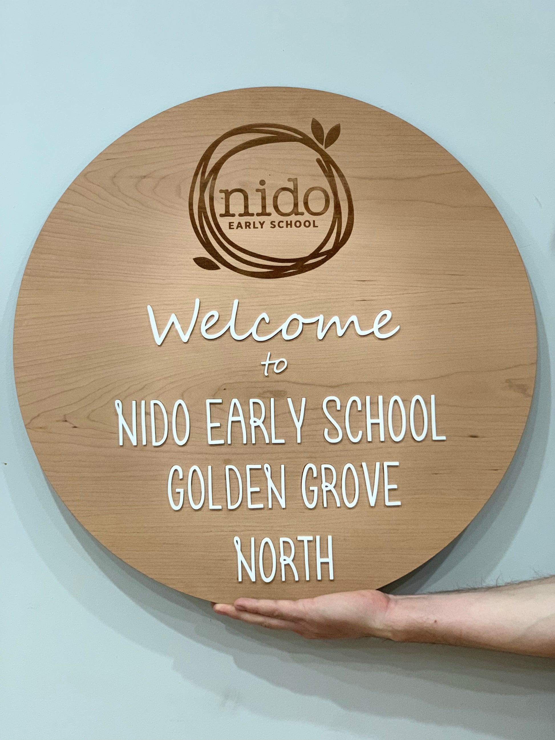 Our 60cm Plaque finished with white acrylic is the perfect statement piece to welcome your customers/clients to your establishment.